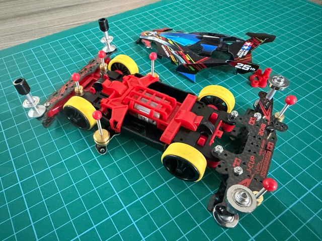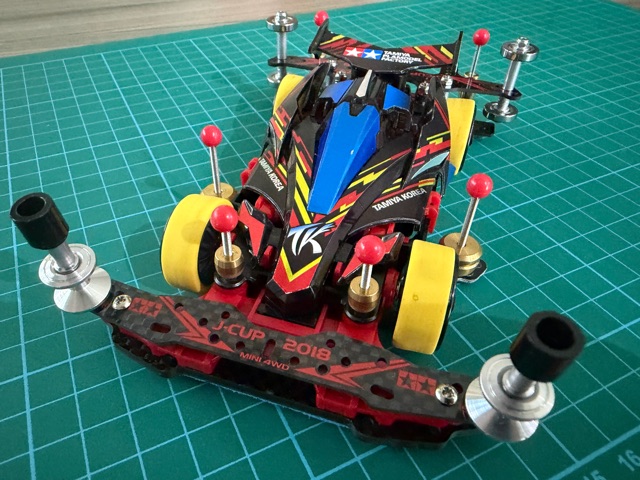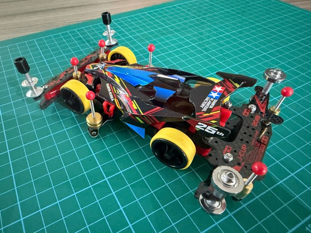 Avante Mk.III Azure Korea 25th (MS chassis) changed out to red carbon reinforced front and bumperless back with carbon front and back plates, high mount with 12mm - 13mm double aluminium rollers front and 13mm bearing rollers back, 3mm carbon plate as front underguard, yellow offset hard tires and carbon reinforced wheels.