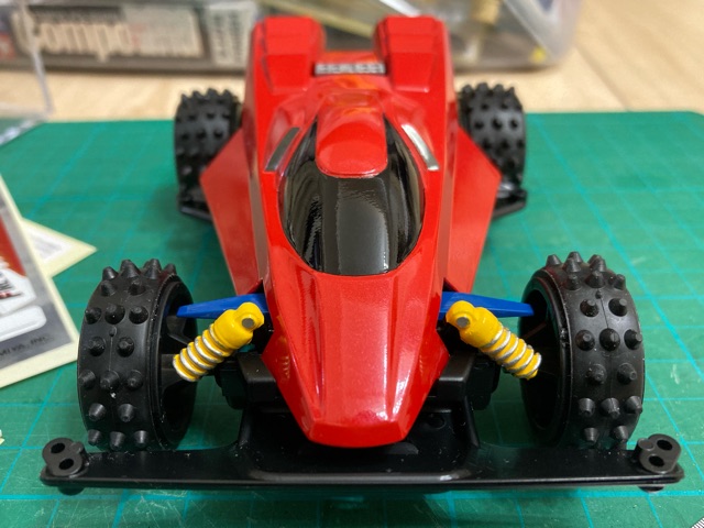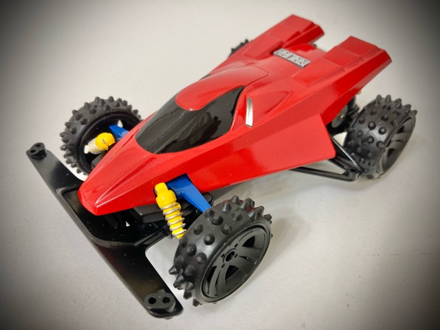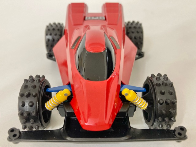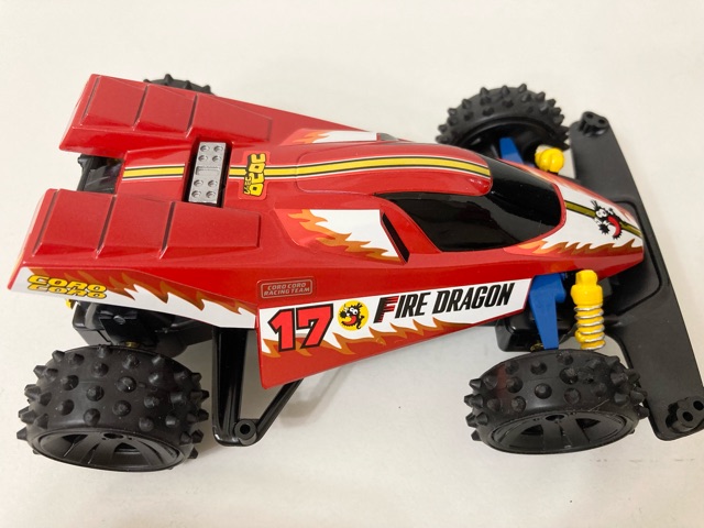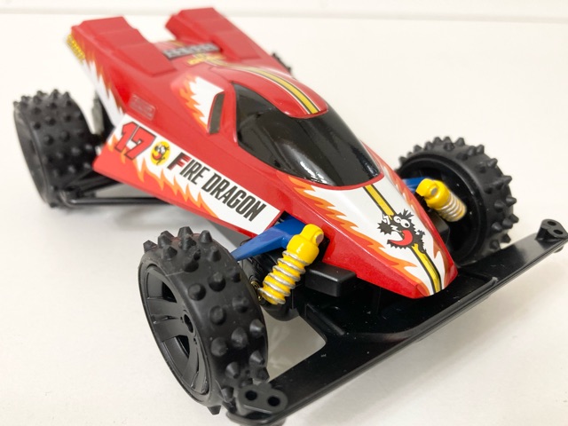 フロントサス周りとテールランプステッカー、黒いホイールとスパイクタイヤで遠目にパッと見でRCカーのファイヤードラゴンっぽい雰囲気を目指してみました。 地上高の高いタイプ3シャーシがよく似合う!