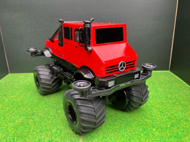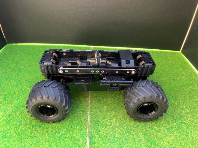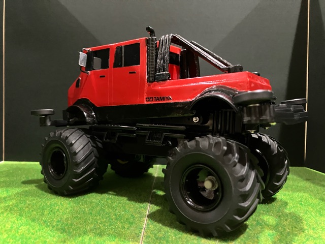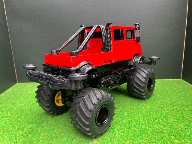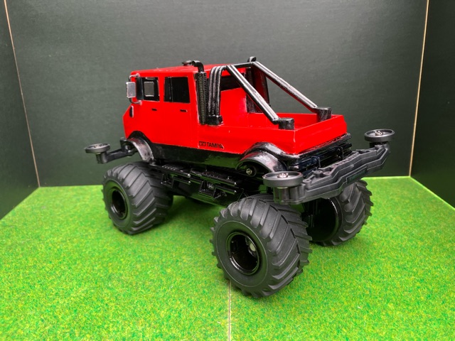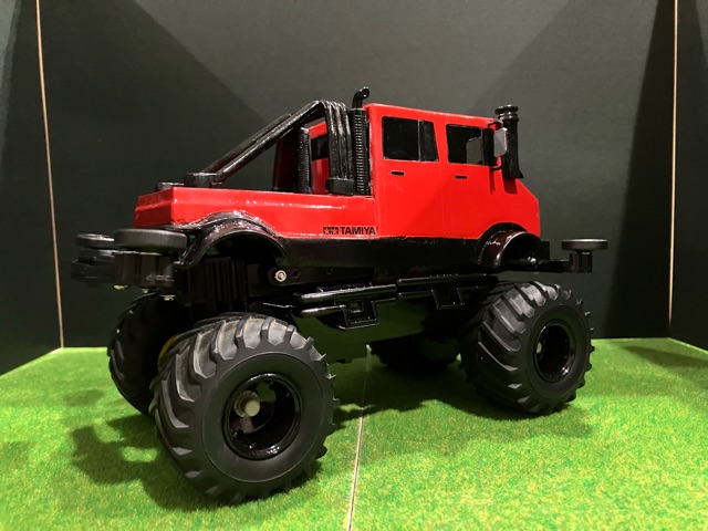 唯一無二のワイルドミニ四駆を作り上げようと、ウニモグ•ダブルキャブボディをセミスクラッチ(K4ギャンボーがベース)しました!シャーシは2台分を繋いでロングホイールベース化、モーターはプラズマダッシュ✖️2機搭載です‼︎ コミカルミニ四駆のウニモグに惚れ込んだ幼少期から、40代後半の今でもウニモグに憧れて続けてます‼︎
