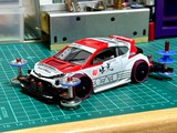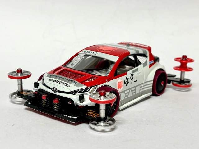 出光興産がまさかのトヨタにスポンサード。 無理あるか... ホンダeで作る予定でしたがヤリスボディで衝動的に作ってしまった。 グループAらしく派手なエアロは纏わず。 公式レースから日々のミニ四駆遊びに酷使するボディとして制作。 こだわりはちょっとかち上げたリアスポと1本ワイパー。ボディ提灯になっていてマスダンパーレスを補います。 公式戦ラストランは華麗にトルネード!残念。 ヤリスは造形が良くて眺めて楽しい。