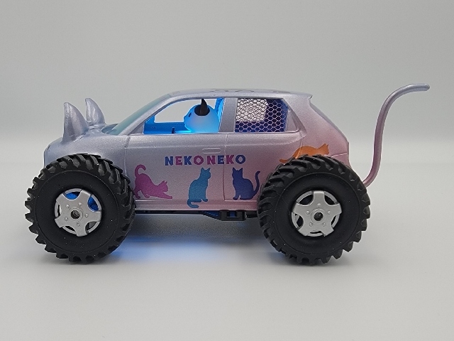 猫王国のMATATABI RACINGより緊急参戦❗️ 仲間達の思いをボディに纏い、荒野のレースへ挑む‼️ フロントに猫の顔、リアに尻尾型ボディキャッチ、足回りにはトラックタイヤを装着しました🎵