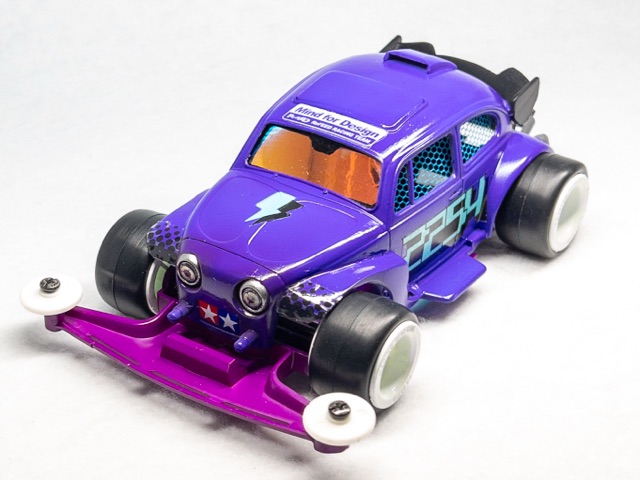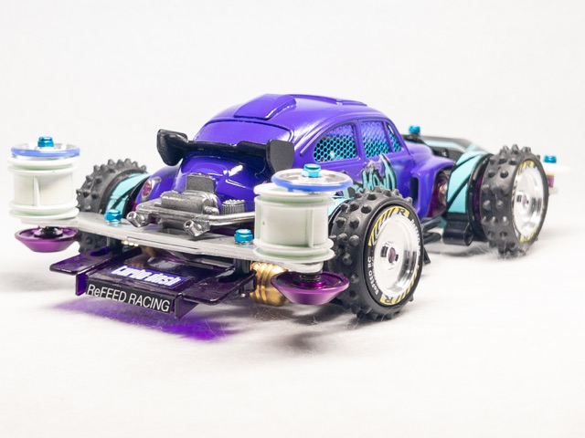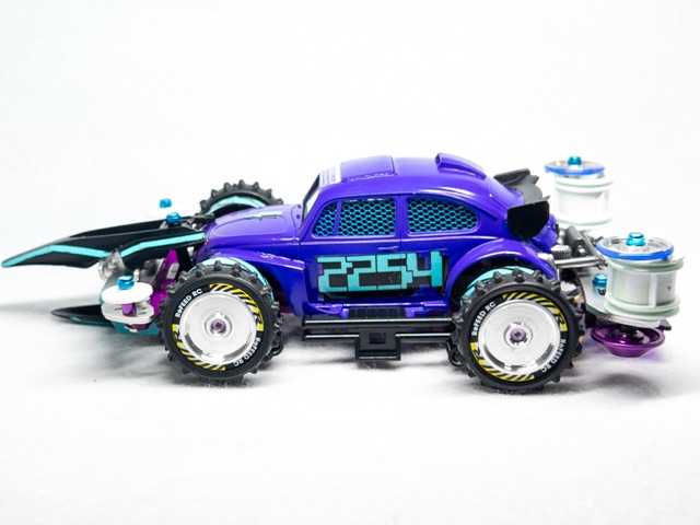 絶版コンデレC アタック部門 出品中 ミニ四駆における最大のパワーを目指して 遊星ギヤーを使用し20:1のハイパワーギヤ比 電池込み260gの超重量にプラズマダッシュモーター搭載の無法マシン アルミパーツ、ウェイト前後装備により、元ネタのスーパーセイバータイソンのように艦船プラモのバラスト用重りを付けずに高重量を実現、車体バランスの安定化を図った 車体はビートルをシティスポーツ風にカスタムしたものをベースに、レーザーパーツとヘラクレスオオカブトをモデルとしたノーズを装着 「誰がオーラバトラー作れって言ったんですか?」 駆動方式だけ先に決定しており、初期案ではネオバーニングサンに可変ウイングを使ったショベルを搭載する予定でしたが ネオバーニングサンが全然手に入らない! なら救済枠のバーニングサンなら…と思ったのですが…… 試行錯誤の末、「本当にやりたかった事」を突き詰め、完成形に至りました 4日という期間でしたが妥協なく思った通りにできました。もっと時間があっても同じ形になった自信があります。