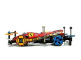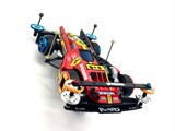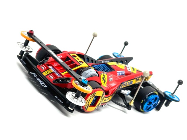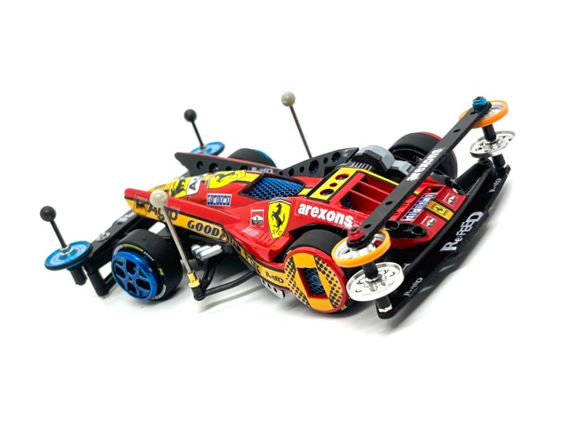 #新春コンデレ2026エントリー作品です^ - ^ ざき少年が幼少期憧れた セッティングといえば、 近所のショップレースで強かったお兄さん仕様。 SFMシャーシにワンウェイホイール、 フロント2段ベアリングローラーに FRP2段重ね仕様。また模型屋さんに 教えてもらったLC対策としての リアポールスタビ。これら幼少期の思い出を コンデレに採用してみました! ワンウェイホイールはキャップのみ、 中径ホイールに合わせて取り付け。 お小遣いの少なさからあるパーツをつかうという コンセプトもありまして ロックナットは左右異色にしました。 (偶然、タミヤカラー!) 憧れの90's64系譜のフェラーリ風ボディには 水色を取入れ唯一無二の雰囲気にしてみました。 丸型の肉抜きを諸所に施して ブルーやイエローに塗装したメッシュを 裏から貼っています。 本年もウマく🐎行きますように🙏