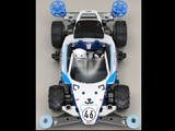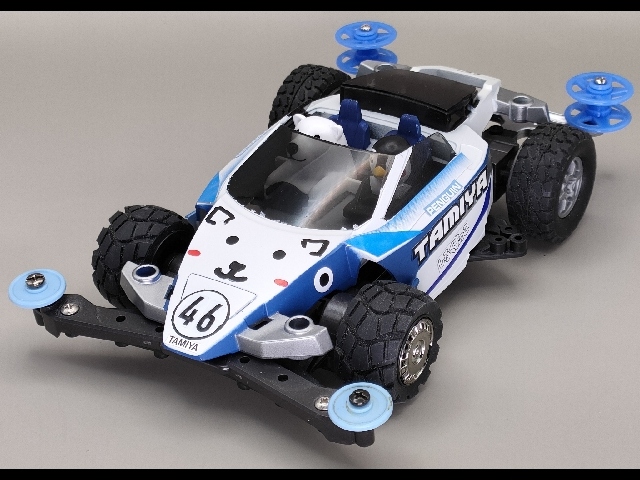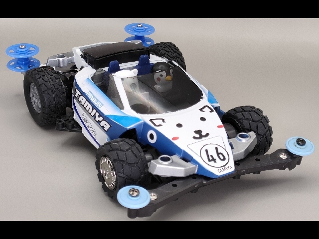 スーパーXXシャーシに載せ替えて、ブロックタイヤを履かせた雪上レース車にしました。 正面は白熊、側面はペンギンをイメージしています。