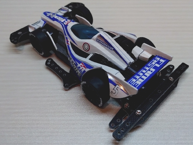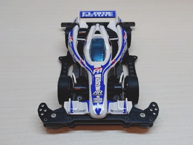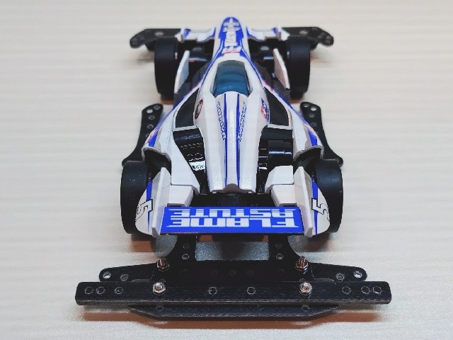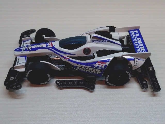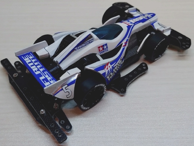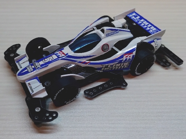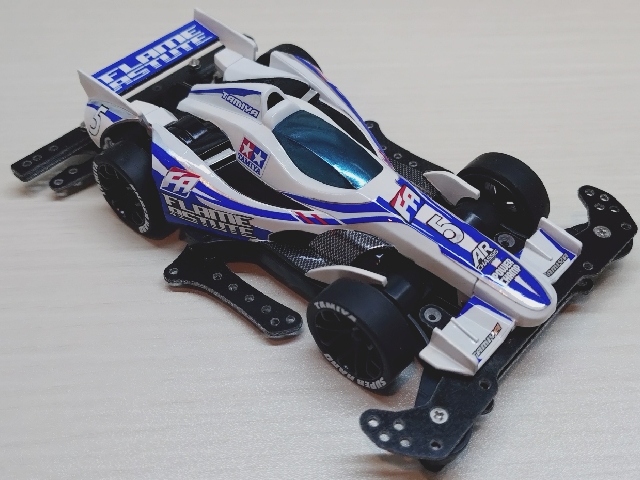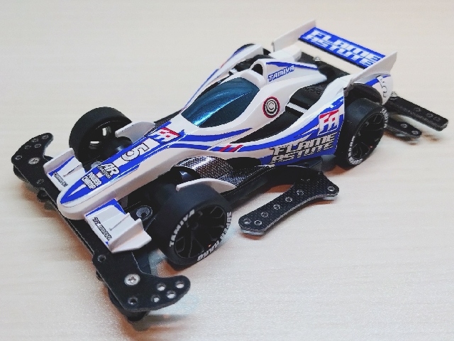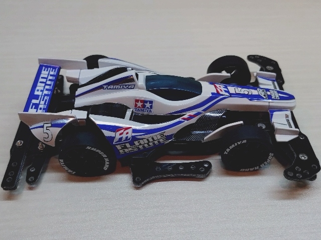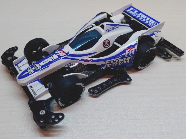 いつもの100均スプレーとステッカーチューン。 ダクト周りを黒くしてシャープな印象にしました。 フレイムアスチュートのボディは低車高で細長く前後に張り出したエアロパーツ造形がとてもGood!