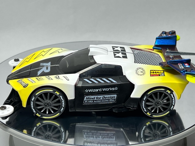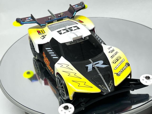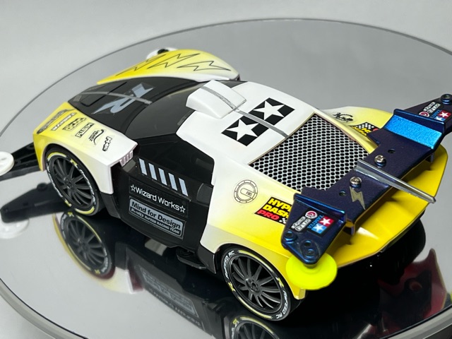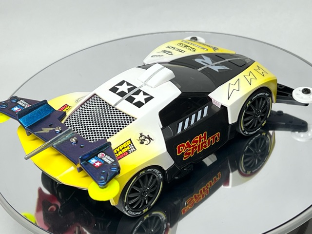 元のフォルムを活かしつつミニ四駆らしさも盛り込んだマシンに仕上げました。 ハイスピードで一刀両断するイメージが伝われば!