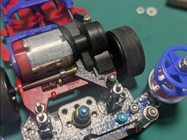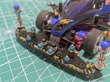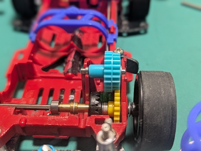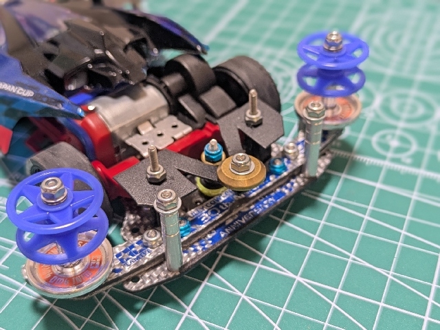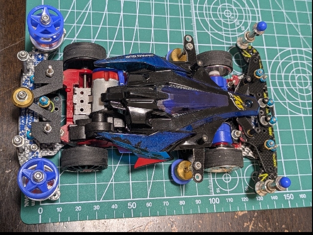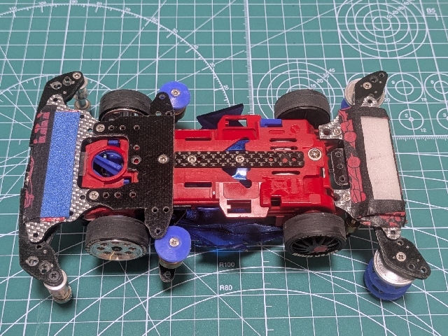 アズールのボディをSUPER2シャーシに載せました! ローハイトホイール、24mm径にカットしたスーパーハードタイヤを装着しました! ローラーベース125mmになるよう前後バンパーを調整しています。 スパーギアのタイヤ側を研き短くして、空いたスペースを利用して、クラウンとスペーサーの間に小ワッシャ入れました。ペラシャ、カウンターギアとスパーギアの干渉が無くなりました。 車重:電池抜き132.3グラム