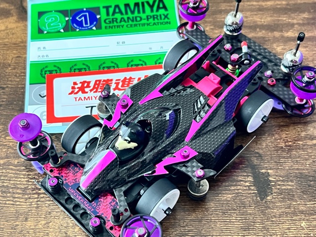 一昨年から使用しているボディを再利用です セイちゃん治具によるリアVカットフレキ タイヤ径24.3mm 4輪ローフリ 新しくスラスト抜け防止プレート リアブレーキも高さ調整の為に追加 リアアンカー(いなしのみ) コーナーを速くする為にリアステーはフルカウルとは別に3mmカーボンを付けています ローリングフォールが何故か苦手で大嫌いなので左前は19AAの2段 他はプラリンです つかじローラー使用 JC東京1 1次 2周目XLスロープで飛びすぎCO ブレーキの高さは良かったが最後部のブレーキが甘く止まりませんでした 次は白と高さ調整 トルク2 25.1km/h 21100回転 1周目9秒前半 2025.10.26 東京3トライアルクラス トルク2 25.5km/h 20800回転 1次42.6秒 1次通過 全車最速タイム 2次43.1秒 2次通過 全車最速タイム A-Bグループ初の決勝進出者 決勝 集合時間に遅刻し失格 集合時間過ぎても勝手なエキシビジョンをやっていたのにルールに基づき なんてあり得ないわ 他のルール違反には目を瞑ったのに 今年は入賞を逃しましたがまた来年頑張ります