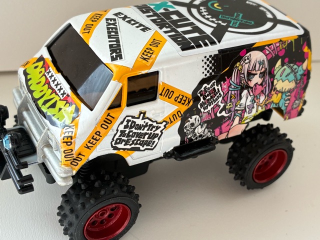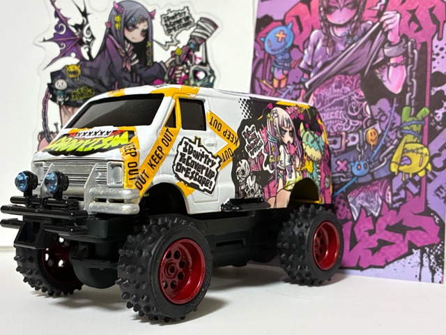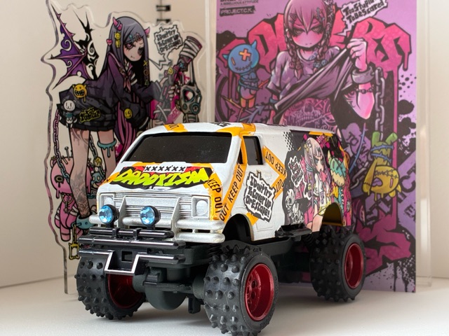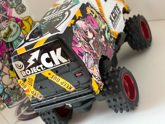 「Lunch Box PCK Custom」 「カッコイイ痛車」をコンセプトに、好きなproject.c.kさんのステッカーをランチボックスに施しました。 EZシャーシにスパイクタイヤを。ボディキャッチをフロントに取り付けフォグランプ風に。ステッカーの世界観にマッチするような塗装をしました。 JC2025コンデレ4にエントリー中
