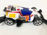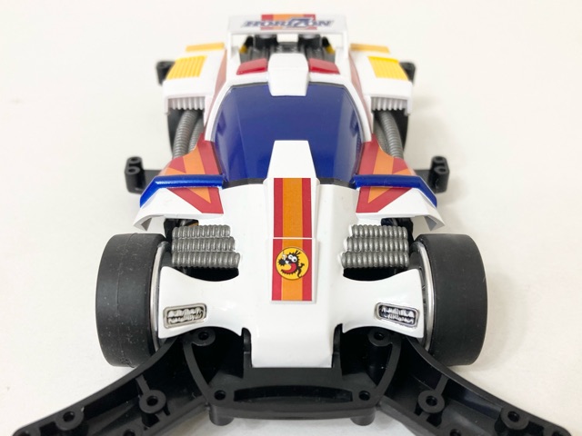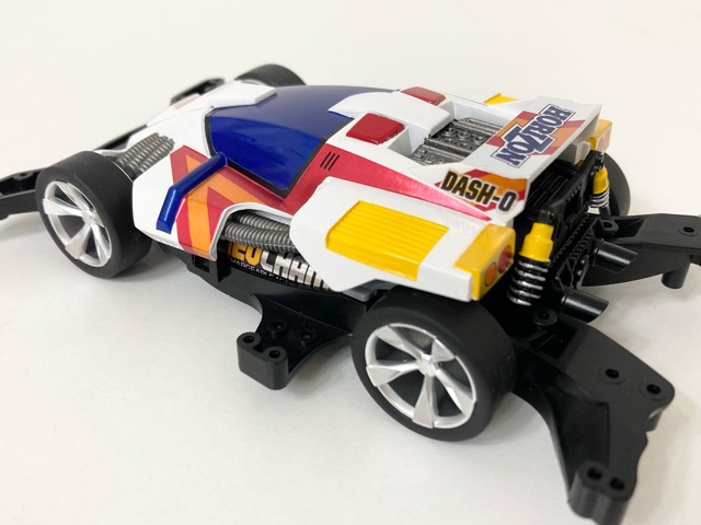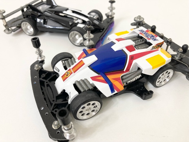 塗装にも気合いを入れて作った、レース用のマシンです。 先ごろ退役した旧ブラックチョッパーに替わり、MAシャーシに対応させたホライゾンを新造しました。 中径タイヤとサイドポンツーンのクリアランスをいい感じにするため、リヤ側を低く加工。リヤウイングも高過ぎる気がしたので、こちらも少し低く。 本当は、フロント周りも原作漫画のようにシャープに尖らせたかったのですが、私の技能ではプラ板やパテでモリモリになって強度が不安だったため、原作再現はルーフ上の謎ディテールにとどめました。 シャーシは入れ替わりましたが、新型ブラックチョッパーと二台体勢でレースに挑む!