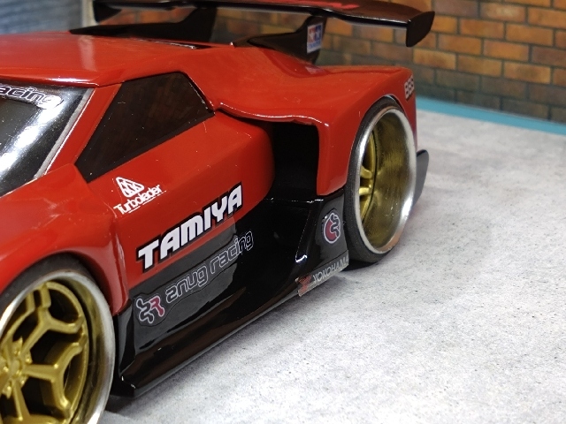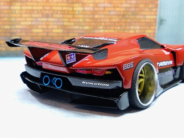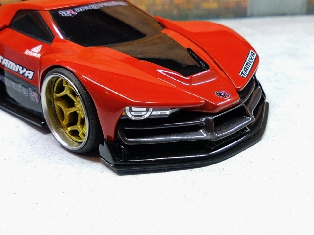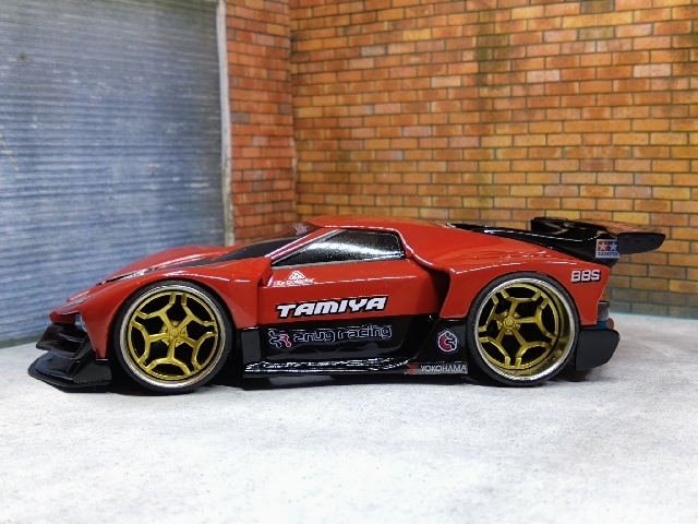 【作品名】 RAIZZAN Evolution 【ベース】 タミヤ ミニ四駆PRO RAIZZAN 【カスタム箇所】 1、フロント及びリヤフェンダーブリスター化 2、フロントエアロ制作 3、フロントディフューザー制作 4、エアロボンネット制作 5、ドアパネル後方絞り込み 6、サイドステップ制作 7、リヤウイングステー制作 8、リヤバンパー制作 9、リヤディフューザー制作 10、ステンレスマフラー出口制作 11、大径リム太ホイール制作 12、3Dリヤスポイラー追加 ライザンの「飛び立つ隼や鷲をイメージした流れる様なローフォルムかつシャープなボディ」のイメージを崩さない様に制作しました ボディカラーはイタリアンレッド×ブラックで、純正イメージカラーを生かしてみました