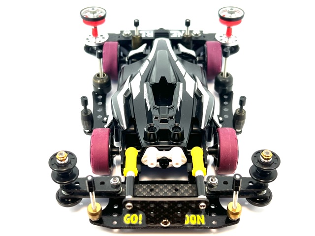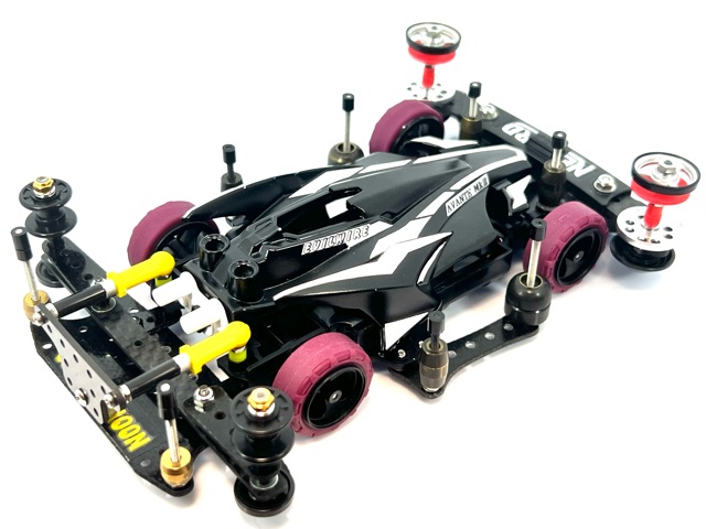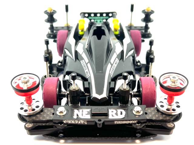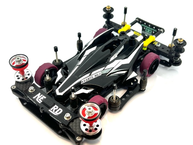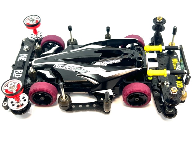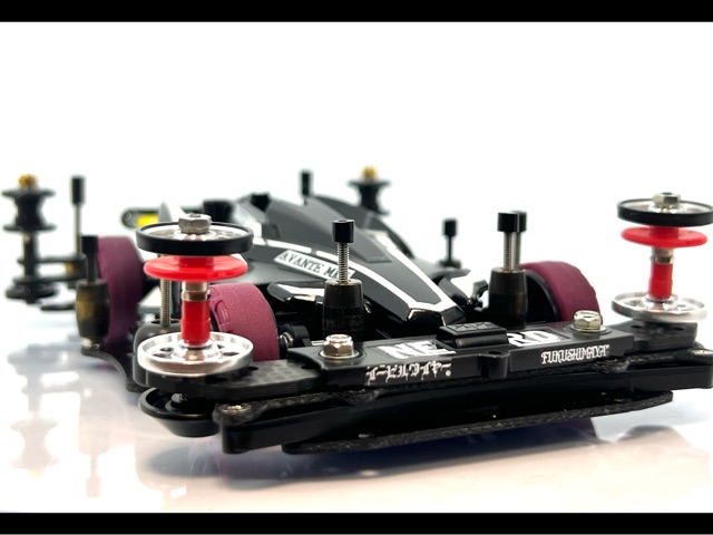 MEシャーシのストッククラス車です MA→MEにアバンテのボディは使い回し フロントローラーはスラダンでアンダーローラー搭載可 VZの時はバンパーレスでしか出来なかった17mmや13 mmのアンダーローラーが付きます リアは走らせてから判断ですが、プレートを柔らかくしてアッパースラストになる狙いで直プレ1枚 内側に撓むのを抑える為につっかえをしています ブレーキプレートの新作が出てからまた手直し 前ブレーキはバンクと同等の角度にして1 mmブレーキしか貼れません 現状バッテリー無しで155gあります